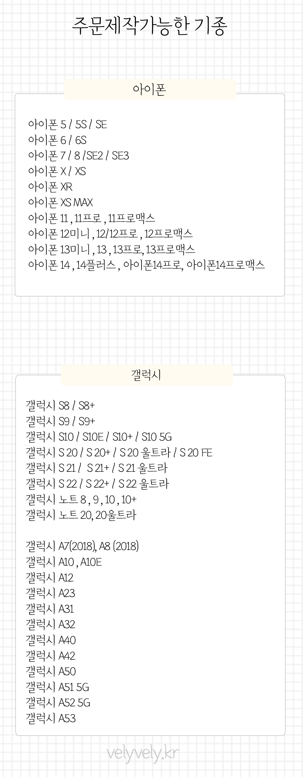 주문제작 폰케이스 아이폰14시리즈 추가되었습니다 !? 14시리즈 추가함과 동시에, 갤럭시 보급형기종 주문이 꽤 많더라구요, 대량주문도 많고 위탁주문도 많아서 찾아보니 초중고학생들이 굉장히 많이 사용한다고해요 !? 케이스 소비연령층이 다양하잖아요 ~? 보급형케이스도 추가하면 좋겠다싶어?기종을 폭 넓게 추가했습니다 :-) ♥ 아래기종은 TPU젤리만 해당됩니다! 하드는 아쉽게도 보급형이 많지않더라구요 ㅠㅠ 하드랑 젤리랑 같이있는 투잇두잇폰케이스나, 셀카댕댕폰케이스 같은경우 제작가능한 기종이 상이하기때문에 헷갈리실것같아 따로 추가해놓지는 않았으나 두상품도 마찬가지로 젤리는 아래기종표로 주문주시면됩니다 !?